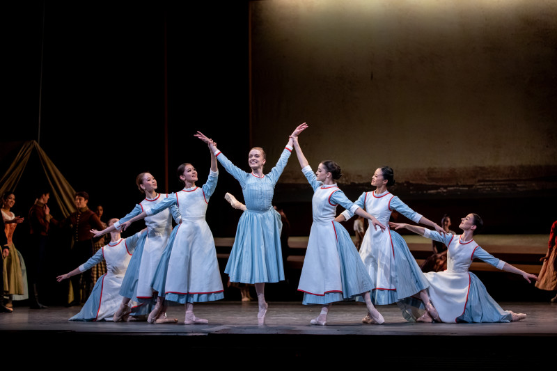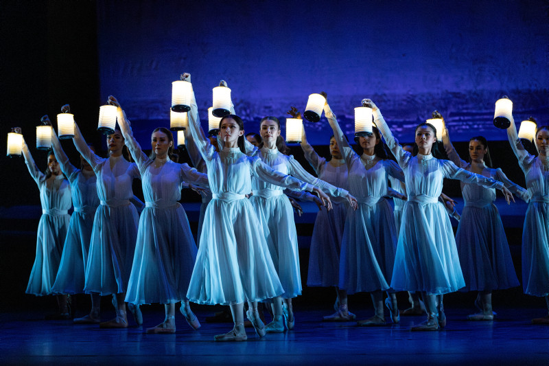Alexander Glazunov’s music, adapted and edited by Gavin Sutherland and Lars Payne, is one of the ballet’s gems, every bit as lush and romantic as a Tchaikovsky ballet score. Another perfect fit was the use of Alexander Gunnarsson’s video projections of the day’s newspaper headlines, (“Conflict Intensifies” and “War Declared” and “British Nurses Step In”), one peeling off after the next, a rapid-fire dissemination of information both helpful and aesthetically pleasing. Another projection succinctly chronicled Raymonda’s journey via a moving map, charmingly reminiscent of an Indiana Jones film, and like that, Raymonda and the audience arrive in the port city of Sevastopol, Ukraine, where the curtain rises, crowds swarm the stage, and we are in the thick of things. The scene is lively, lots of dancing and camaraderie, great ensemble work and close-ups on John (Wei Wang)and his friends (Luca Ferrò and Lucas López) and Raymonda (Wona Park) with hers (Isabella DeVivo as Henriette and Jennifer Stahl as Sister Clemence). Excellent dancing abounds; really, I can’t point out one place where the dancers were less than sublime. Particularly impressive was the unison dancing, right on the money, time after time. The men’s jumps in particular. Wow, so airborne, so clean, so much fun to watch, and it seemed like the dancers were enjoying themselves, too, clad in Antony McDonald’s colorful, varied costumes.